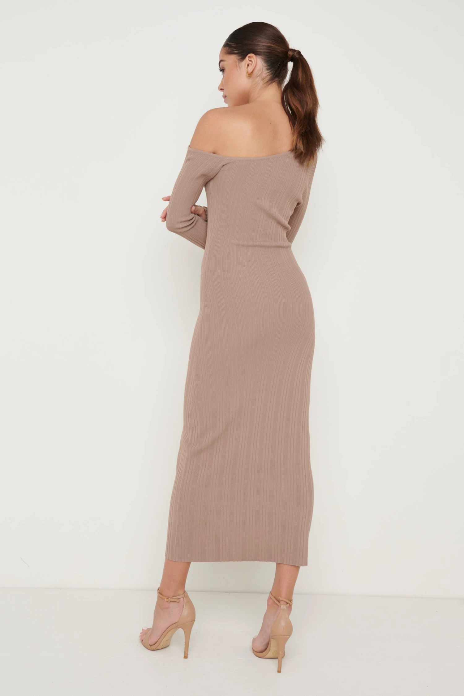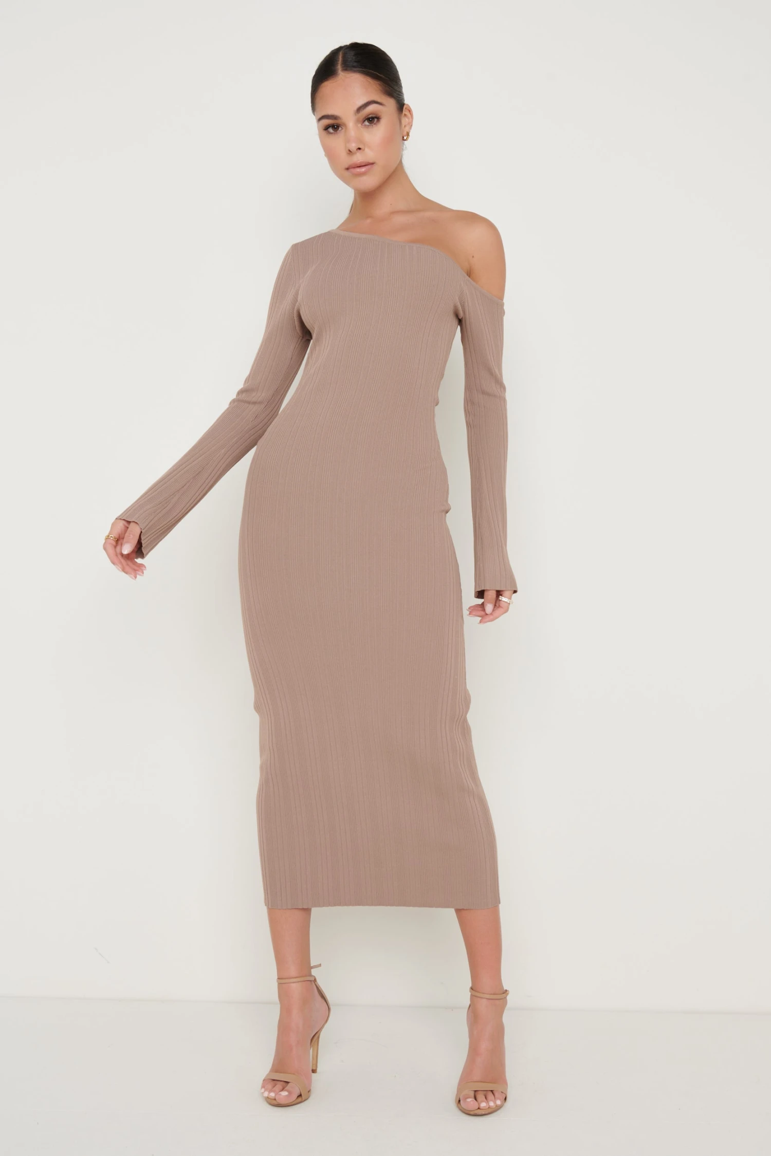 Designed with a sleek asymmetric neckline, this Midaxi dress has a slim bodycon silhouette that subtly flutes at the hem. Compliment its hue with neutral heels.