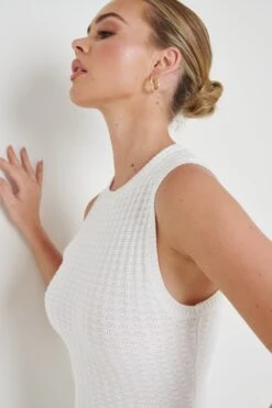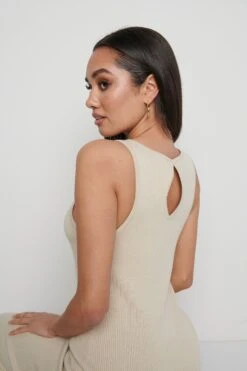 Our best selling Billie is back and better! The mid- weight knit fabric now has a half moon cut out detail on the back to give the racer silhouette that feminine feel. The beige knit has a ribbed finish that feels soft against the skin and is the perfect weight to transition into summer. Style yours from dawn to dusk by swapping trainers to heels and a clutch bag.