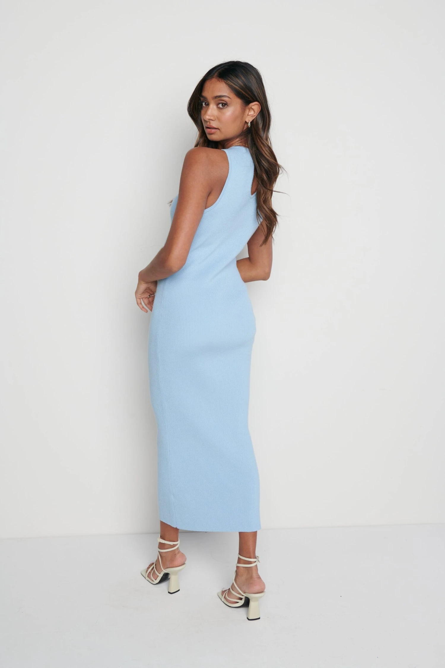 The Billie midi dress is made from a blue mid-weight knit fabric with a ribbed finish that feels soft against the skin. The racer silhouette is so on trend this season, style yours from dawn to dusk by swapping trainers to mules.