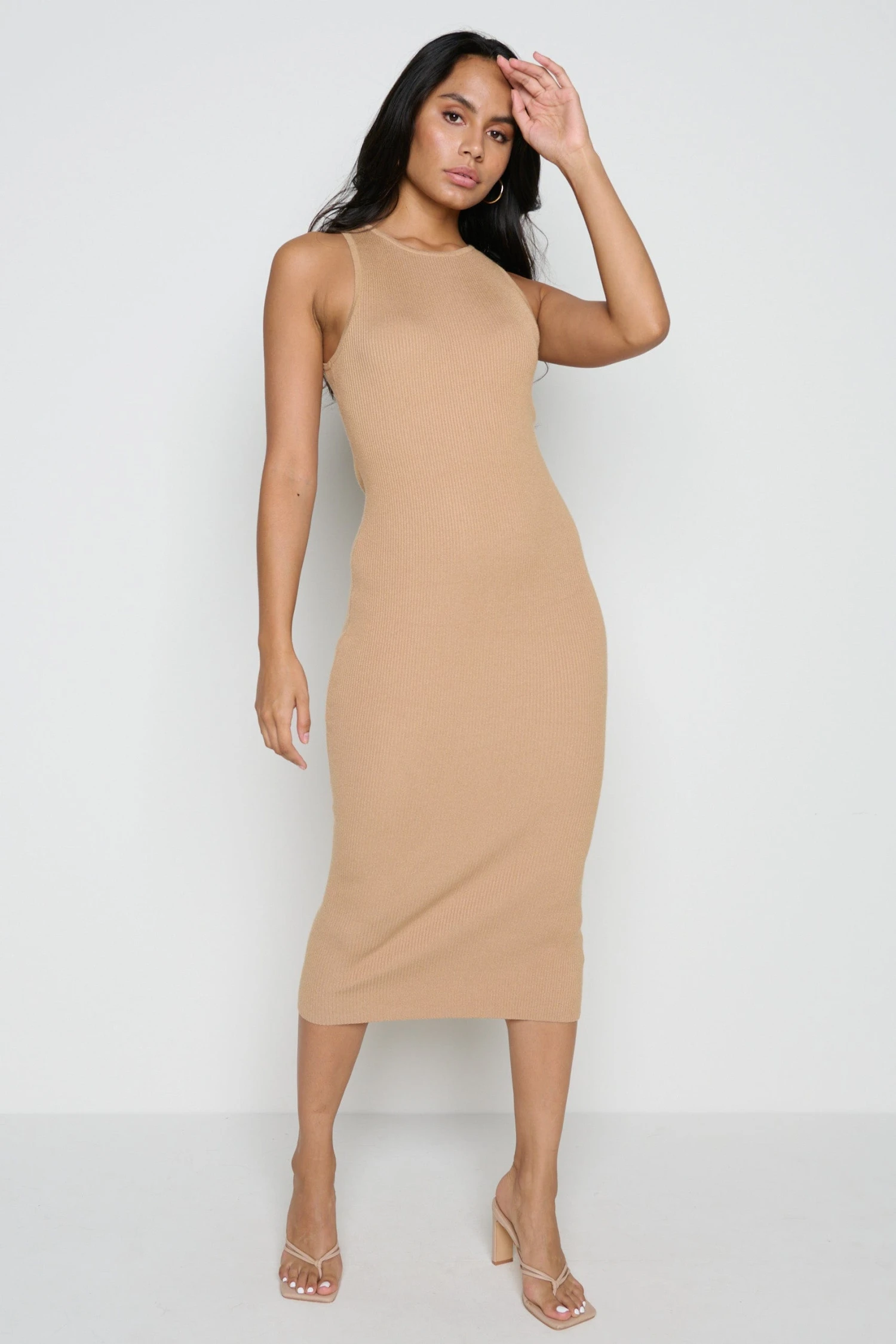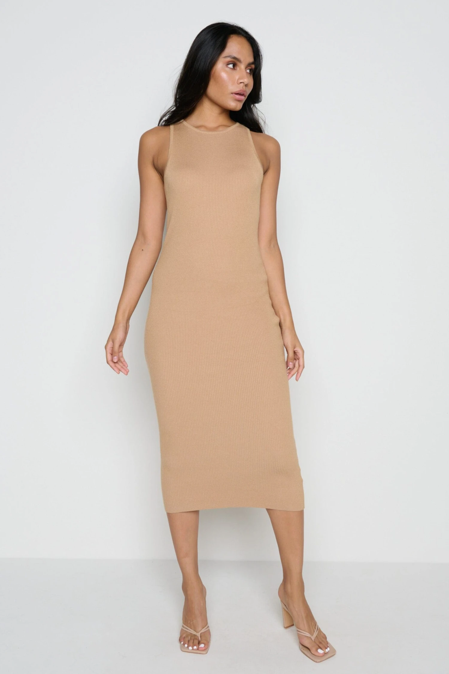 The Billie midi dress is made from a camel mid-weight knit fabric with a ribbed finish that feels soft against the skin. The racer silhouette is so on trend this season, style yours from dawn to dusk by swapping trainers to heels.