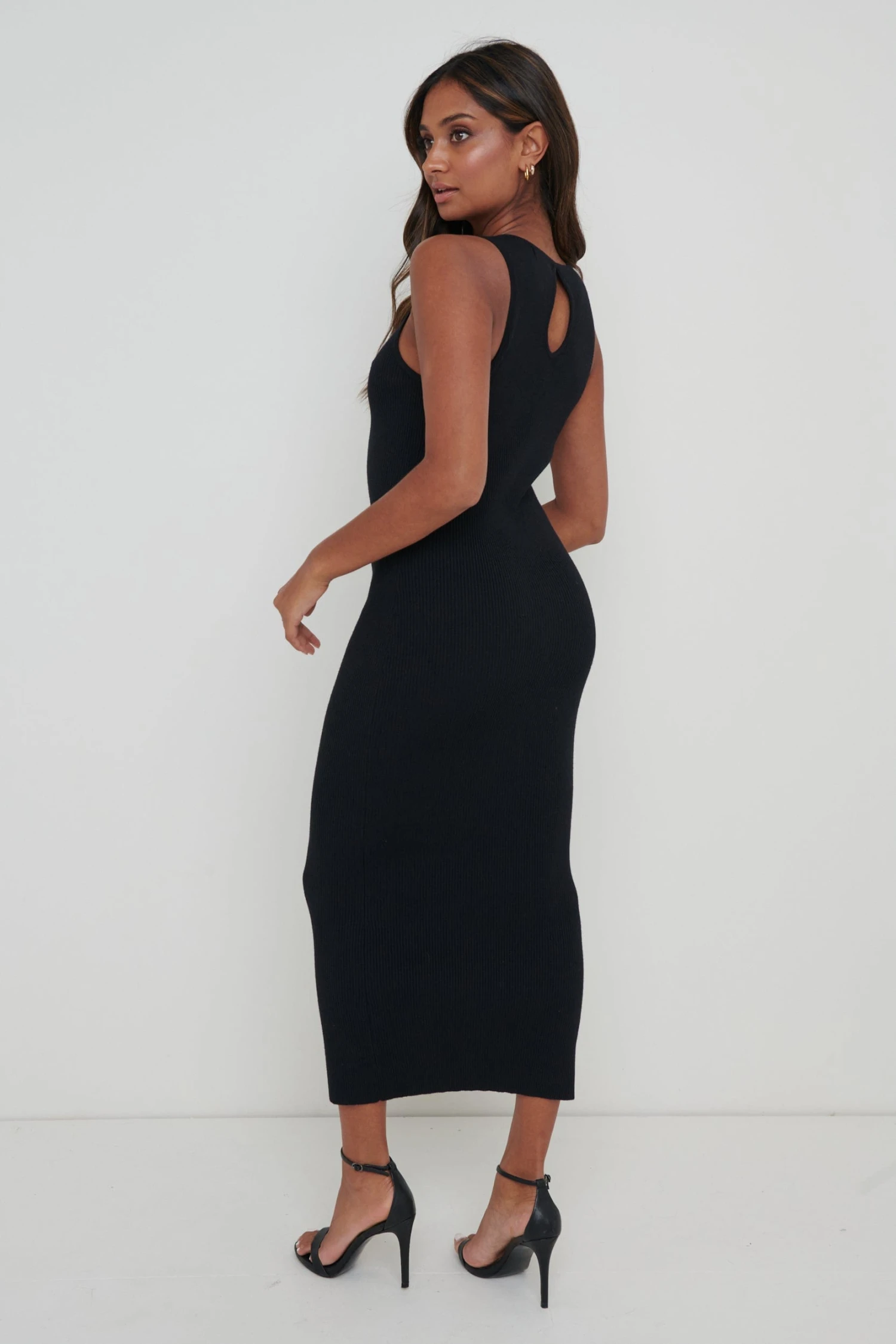 The Billie midi dress is made from a black mid-weight knit fabric with a ribbed finish that feels soft against the skin. The racer silhouette is so on trend this season, style yours from dawn to dusk by swapping trainers to heels. The dress has a small elegant keyhole opening on the back neck.