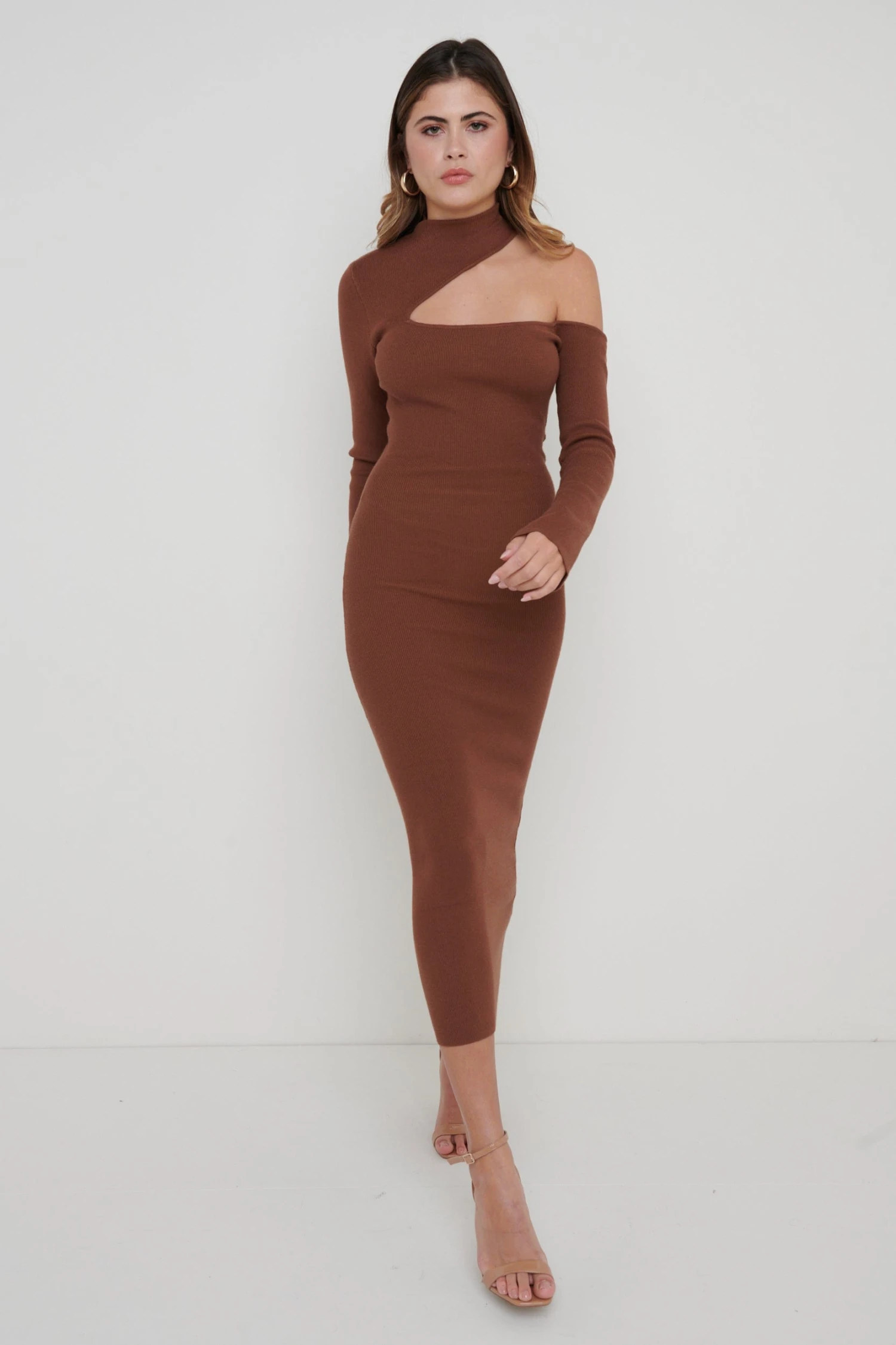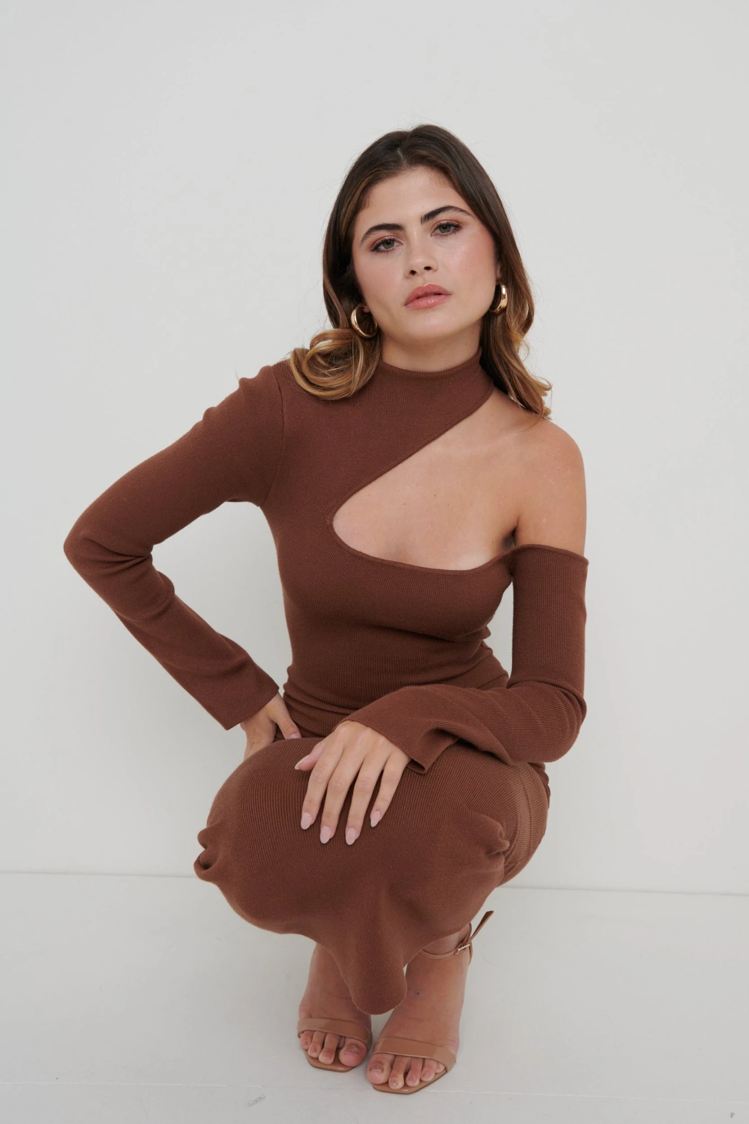 Featured from our Maximal Minimalism September October collection. Cut from a body-skimming ribbed-knit, this grown on neck dress has a sleek and simple silhouette with cut-out detail. Wear it casually with boots or dress it up for night with strappy heels.