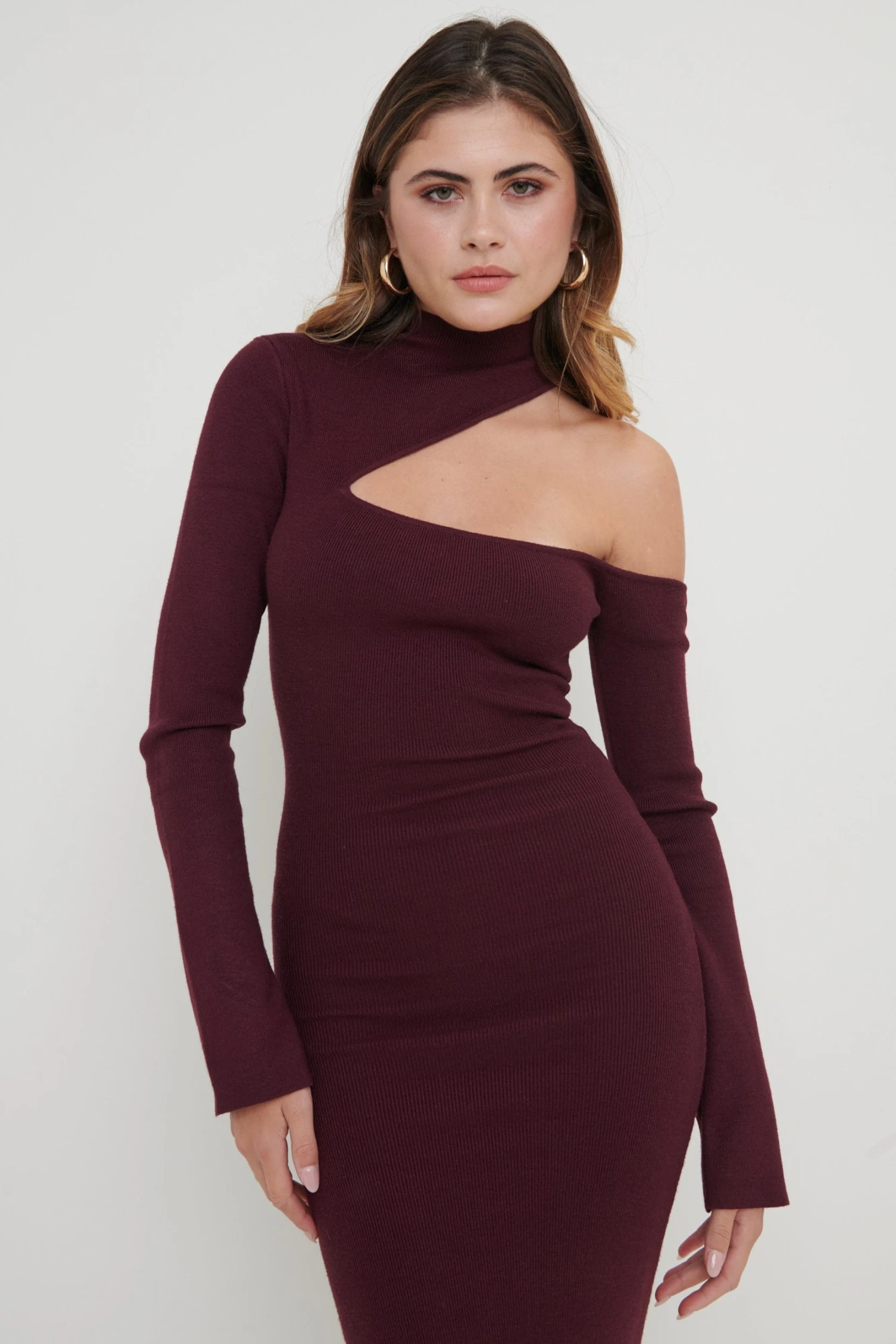 Featured from our Maximal Minimalism September October collection. Cut from a body-skimming ribbed-knit, this grown on neck dress has a sleek and simple silhouette with cut-out detail. Wear it casually with boots or dress it up for night with strappy heels.