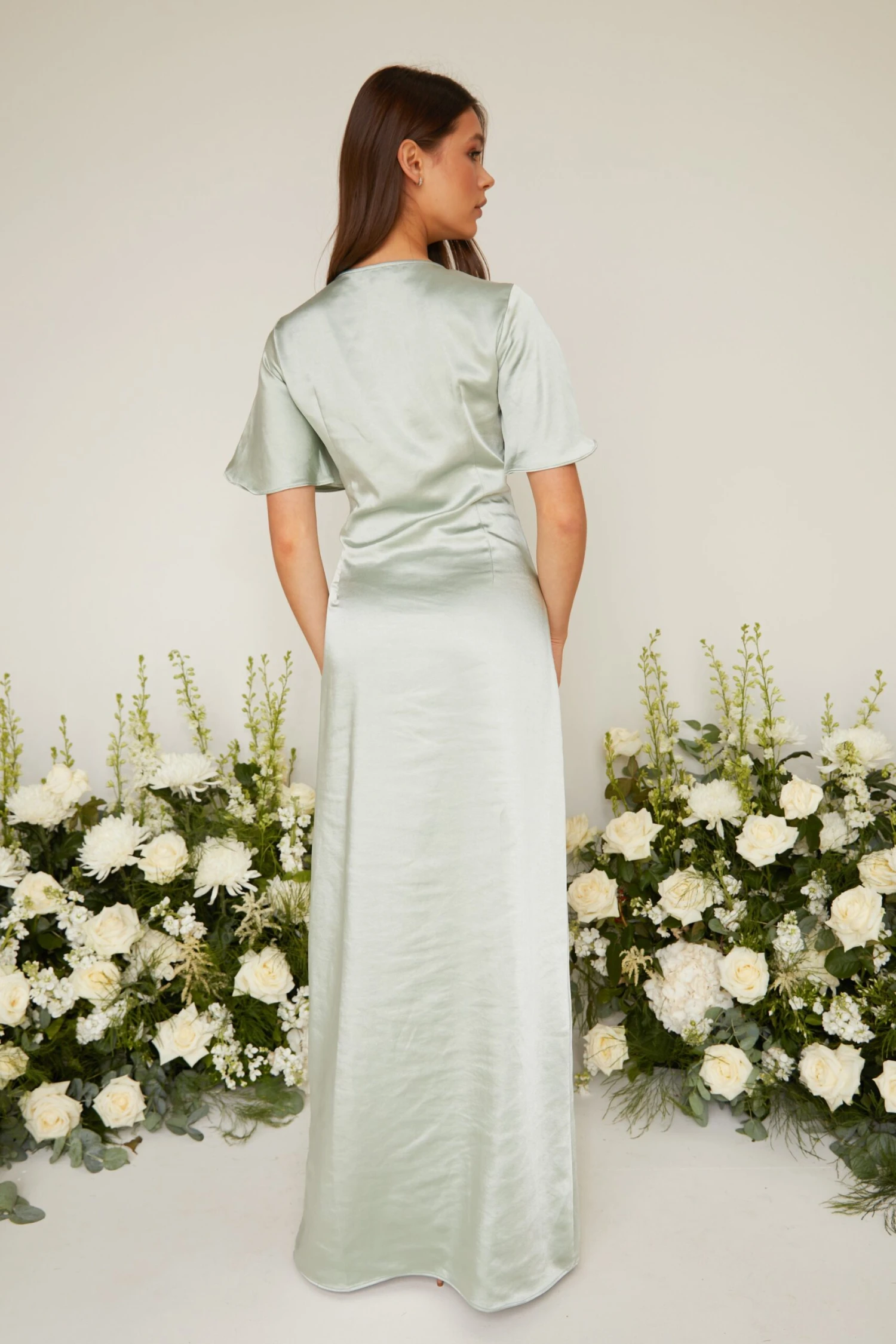 The Naya dress has been elegantly cut into a gentle v shaped neckline with a button through front that effortlessly gives way to a feminine split. Known to skim every figure and drape fluently to the floor your bridesmaids will feel their best wearing this dress. Choose carefully from our three exclusive SS21 pantones or mix and match with our wide range of bridesmaids dresses.