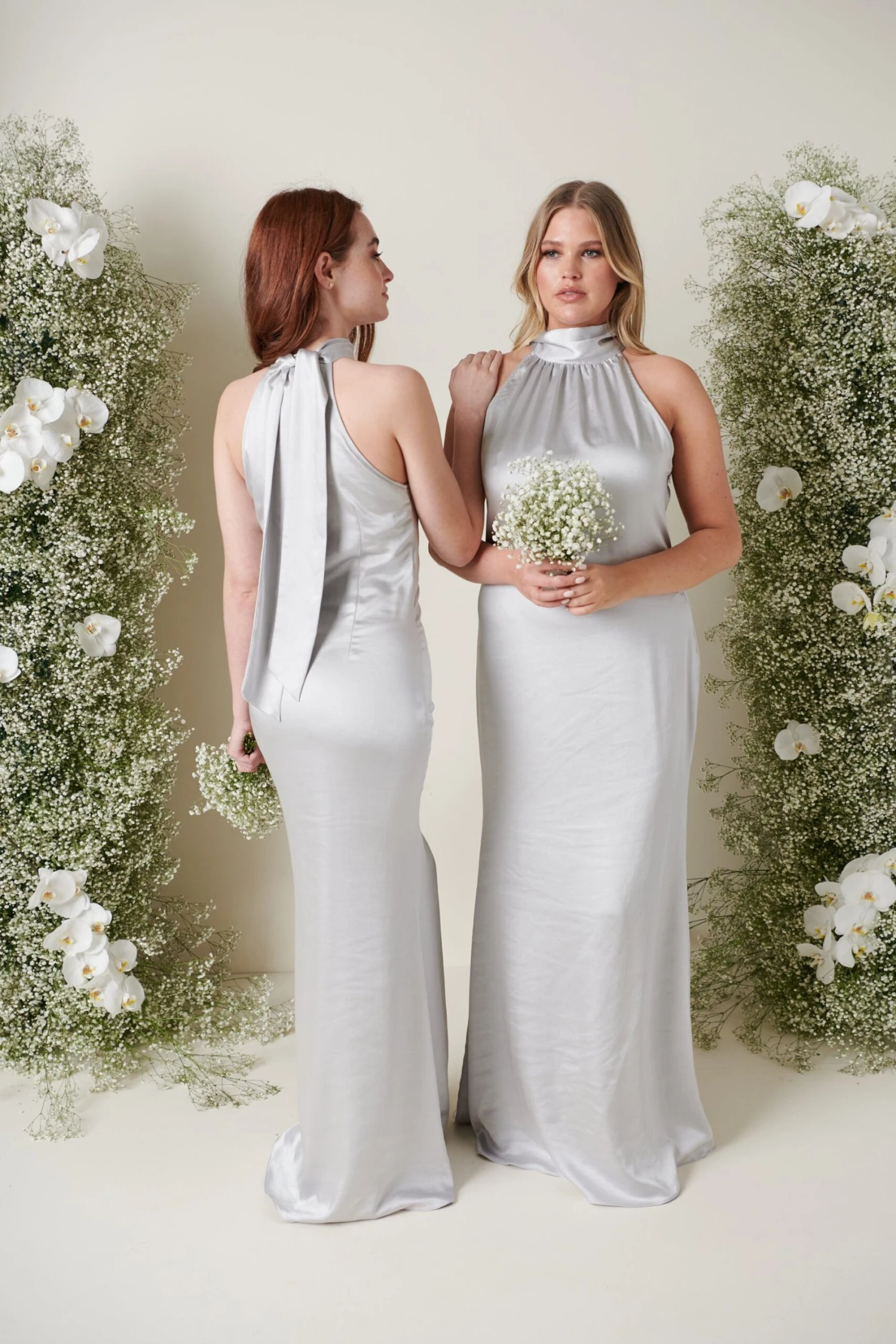 - Pair with our other silver satin dresses for a modern mix and match bridesmaid look.