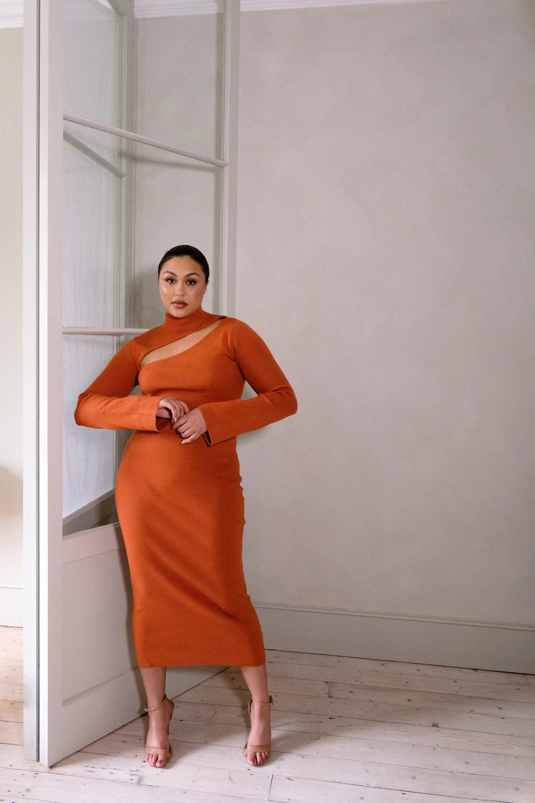 Featured from our Maximal Minimalism September October collection. Cut from a body-skimming ribbed-knit, this grown on neck dress has a sleek and simple silhouette with cut-out detail. Wear it casually with boots or dress it up for night with strappy heels.
